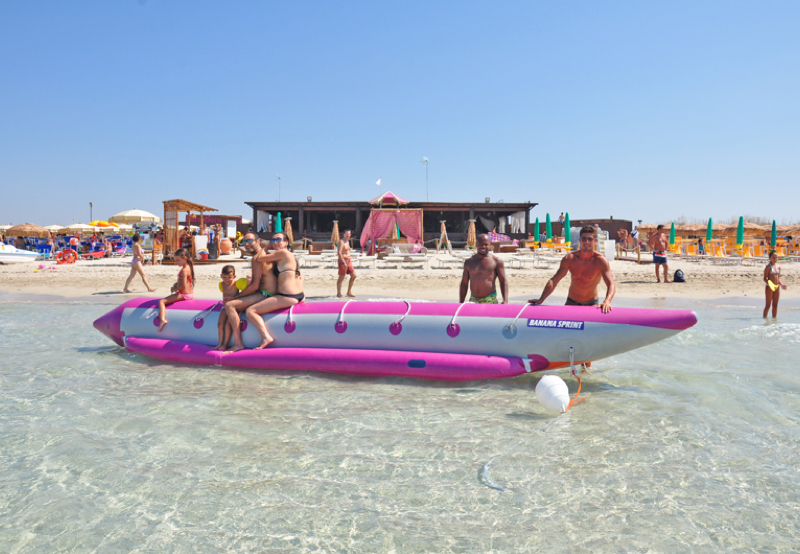 Collegamento diretto con sottopassaggio interno all’hotel a zona di bassa scogliera terrazzata. Spiaggia attrezzata con sabbia riportata, ombrelloni e lettini con accesso facilitato per l’ingresso in mare. In alternativa è possibile usufruire dei servizi del Lido Bora Bora uno dei più belli della zona a 3 km dall’hotel raggiungibile con servizio navetta. Possibilità di noleggio teli mare.